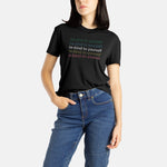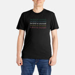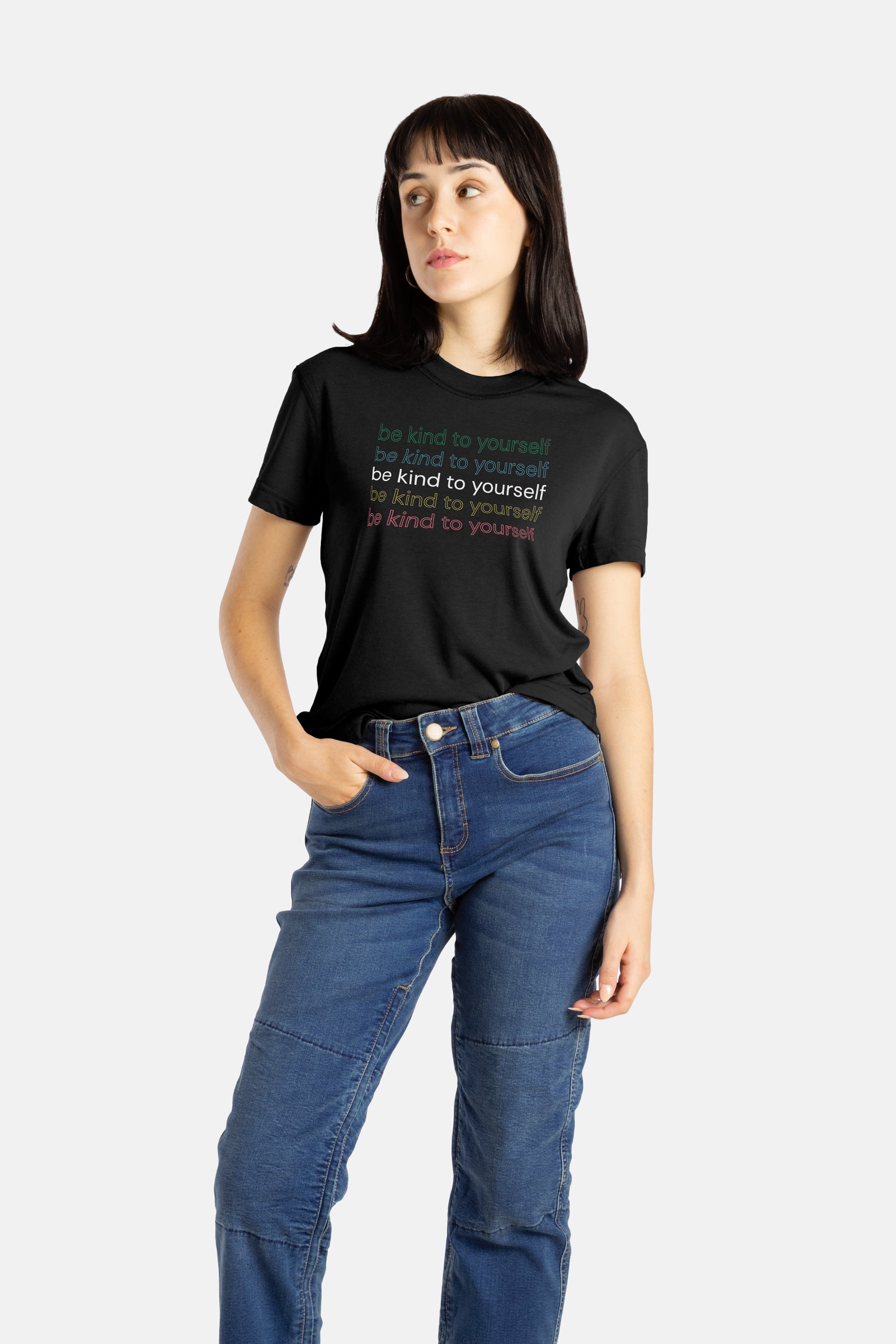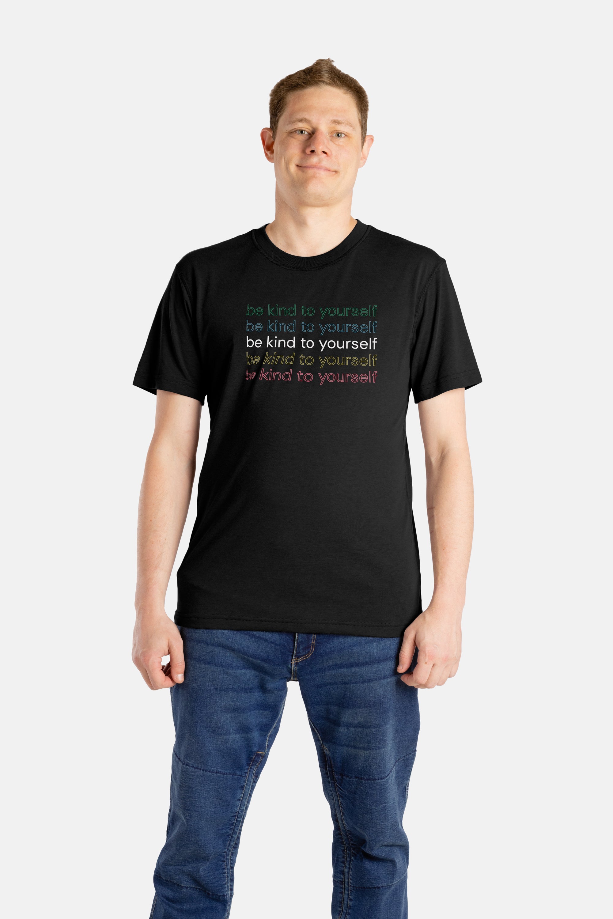 This black short sleeve tee has the words "Be Kind To Yourself" repeated 5 times across the chest in the colors of the Disability Pride flag.