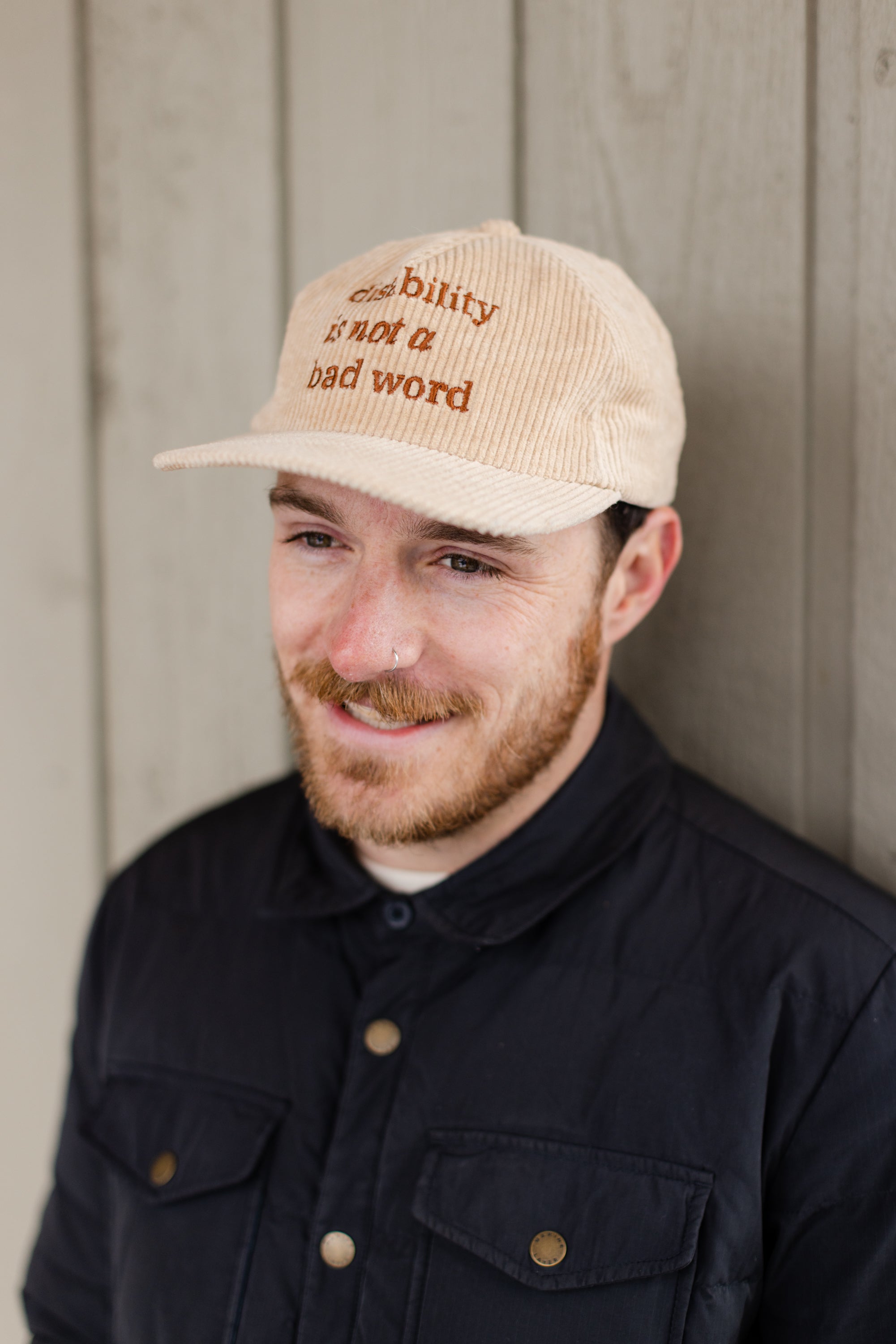 Louder for the people in the back! This cream corduroy flat-billed hat has a metal adjustable clip in the back and "Disability is Not a Bad Word" embroidered on the front in lowercase tan font.