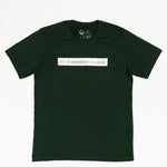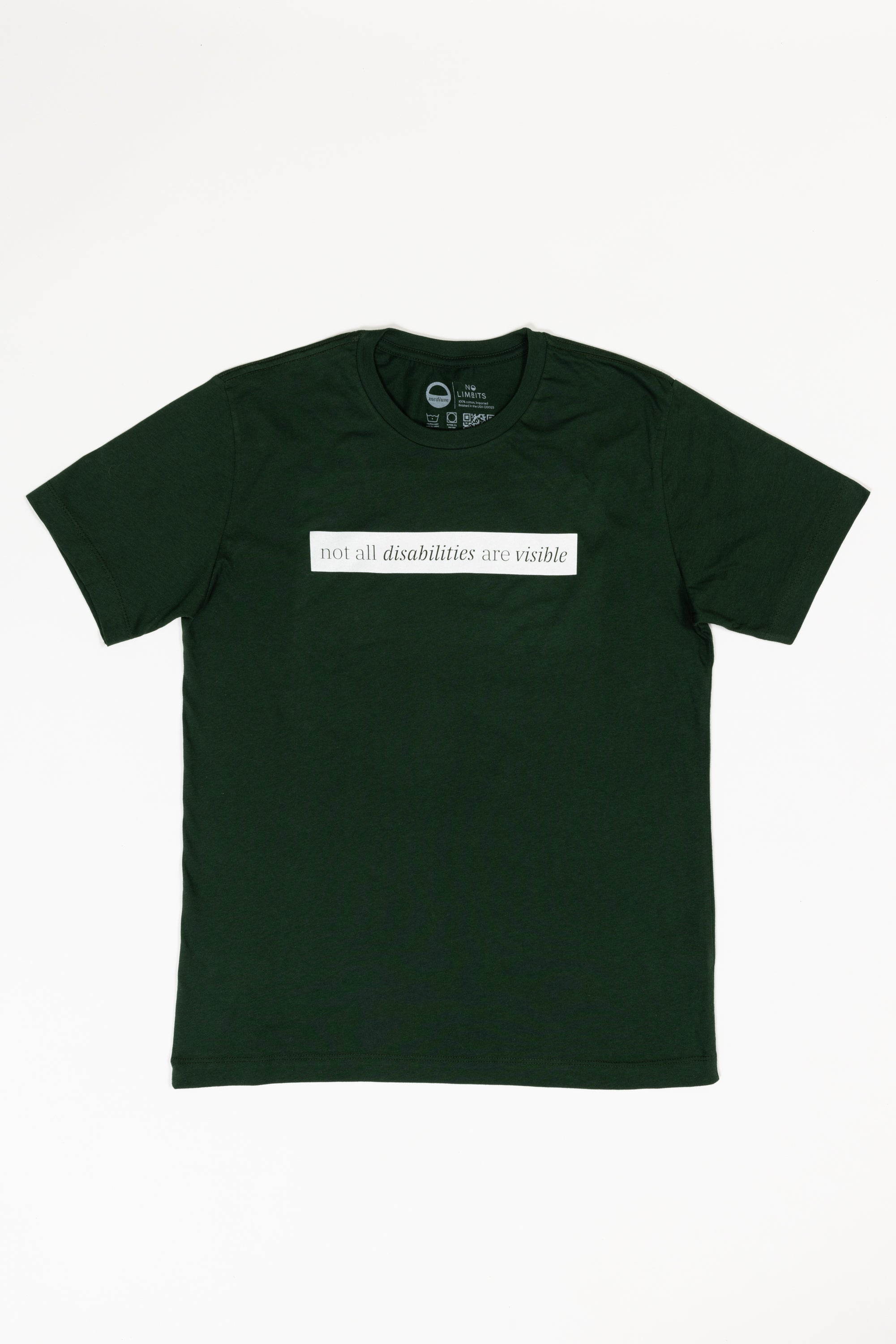 This forest green short sleeve tee has a beige block printed on the front chest. The words "Not All Disabilities are Visible" are on this block.