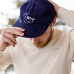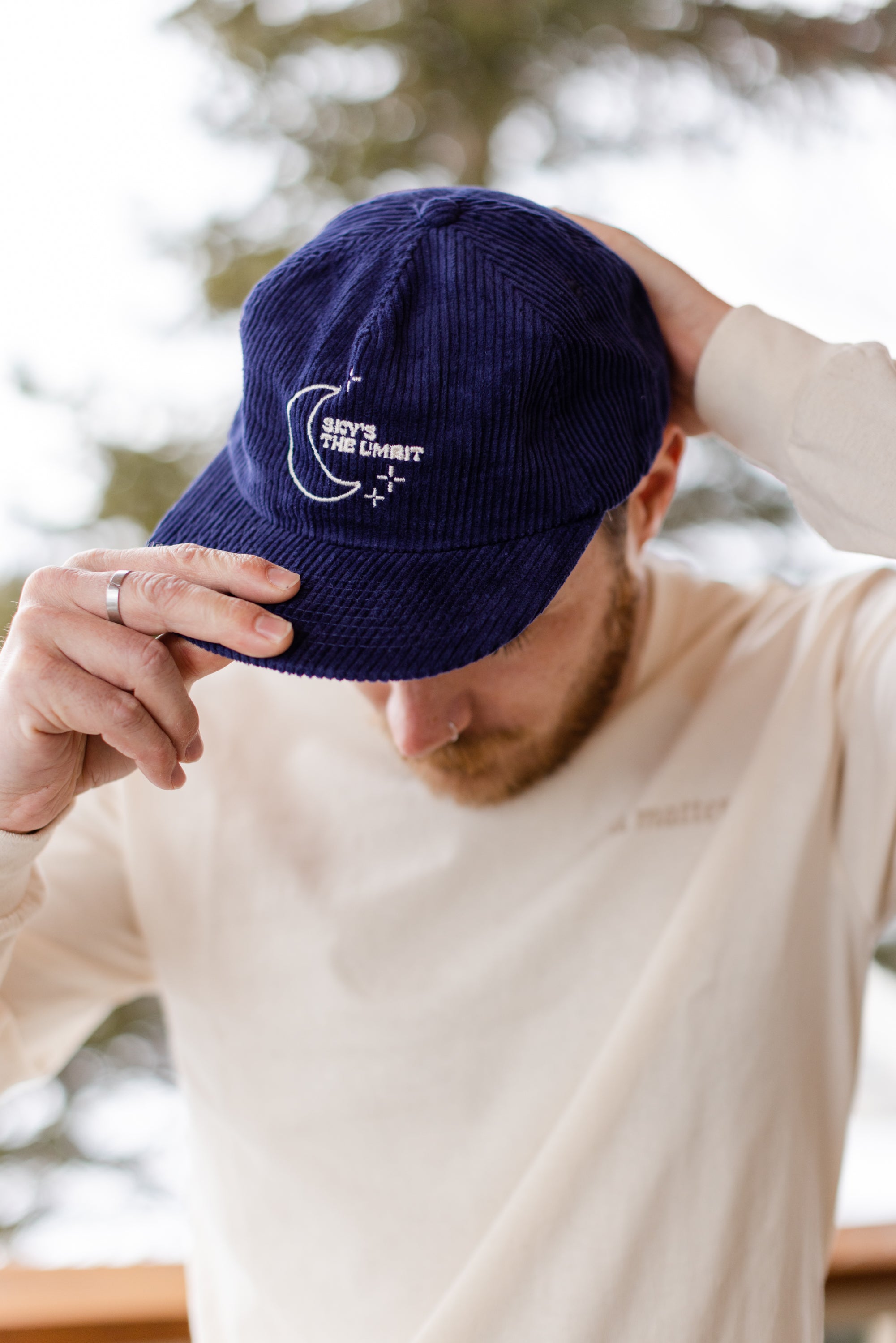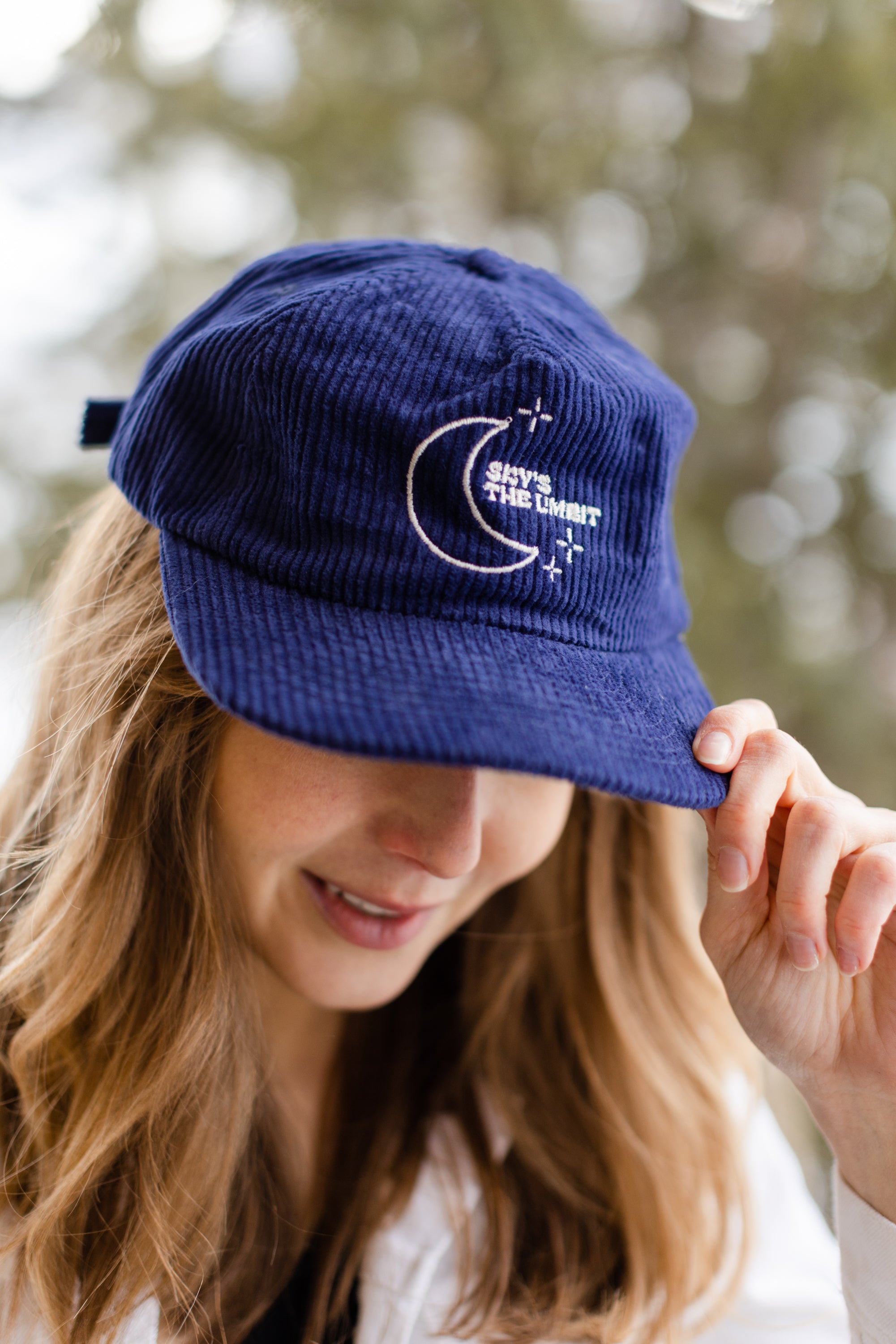 This navy blue corduroy hat has a flat bill and metal adjustable clip in the back. A moon, stars, and the phrase "Sky's the Limbit" are embroidered on the front in white thread.