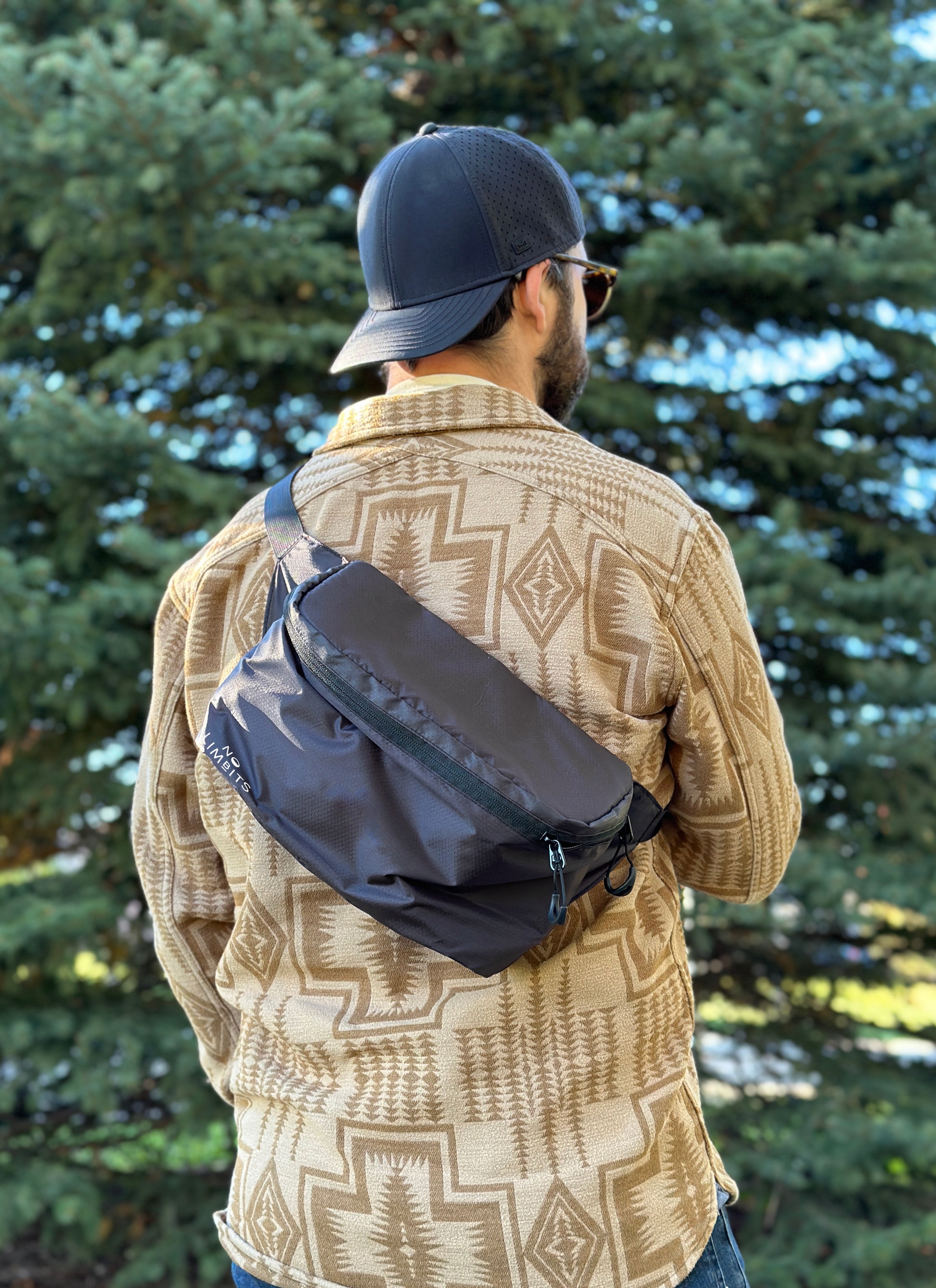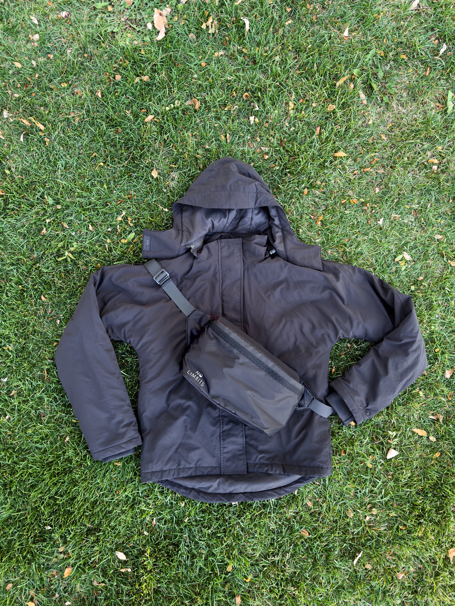This sling bag was designed as the perfect companion to our Limited Dexterity Jacket as the jacket can be packed down to fit inside it.